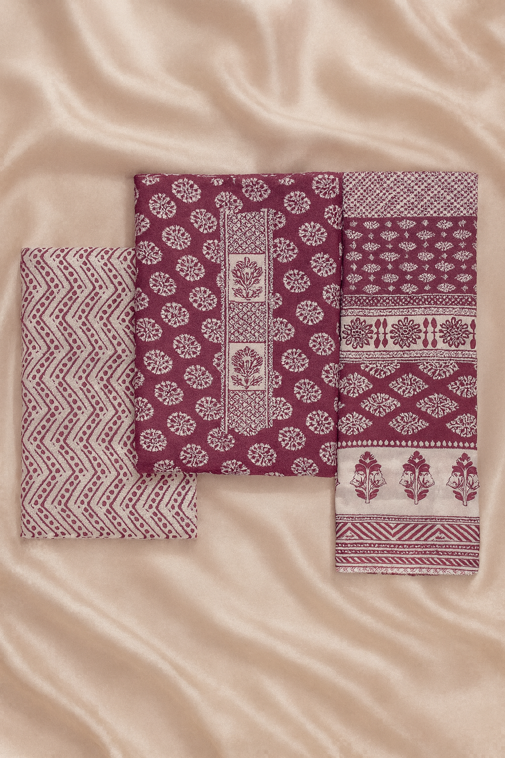 Add a touch of elegance to your ethnic collection with this pure cotton 3-piece dress set in a rich wine shade. The set includes a beautifully printed kurta fabric, a coordinated bottom, and a matching dupatta, all adorned with delicate white floral and geometric handblock-inspired motifs. Crafted from soft, breathable cotton, this ensemble ensures all-day comfort while offering a graceful, timeless look. Ideal for festive occasions, casual outings, or everyday ethnic wear, it perfectly blends tradition, comfort, and style.